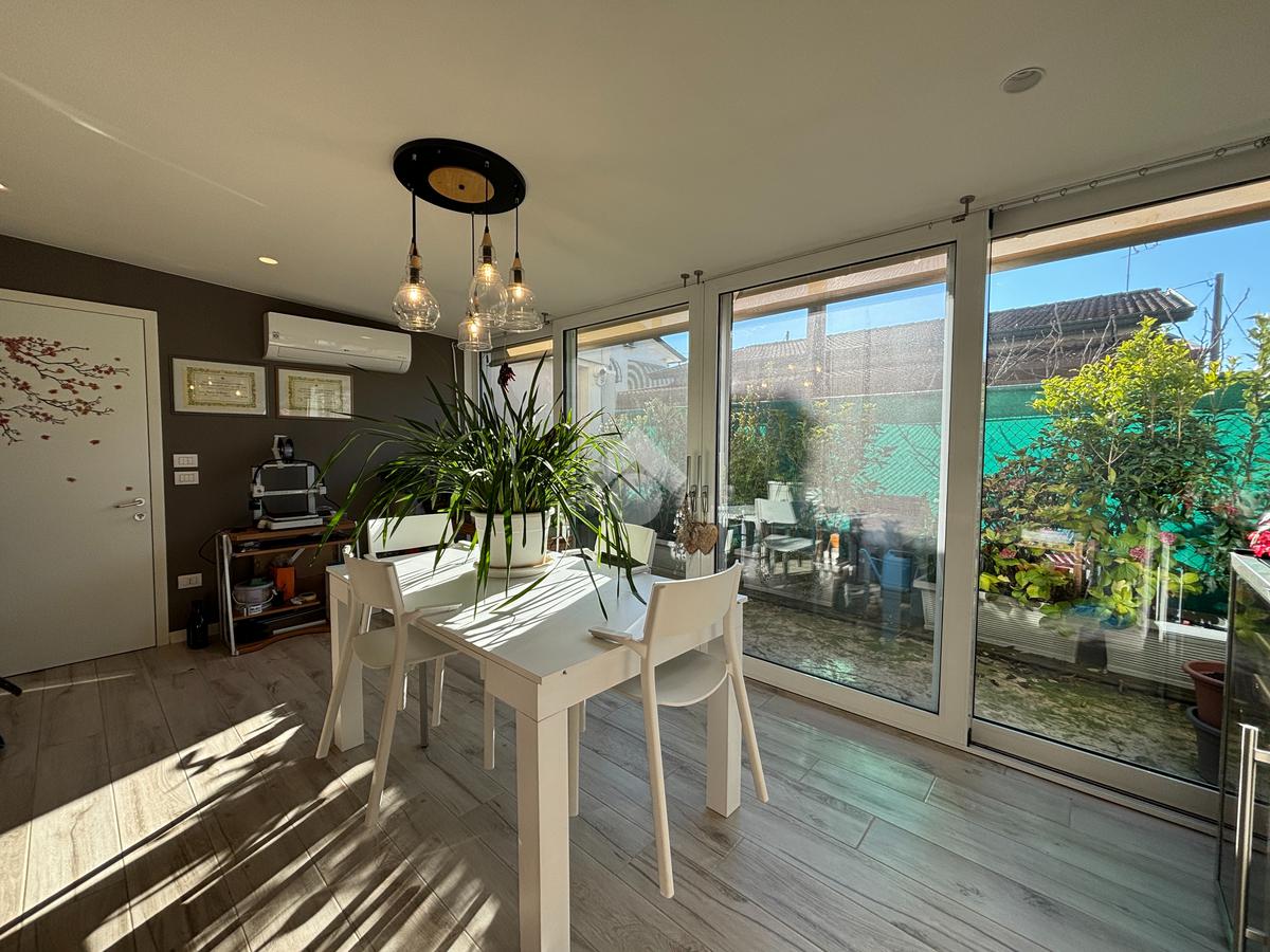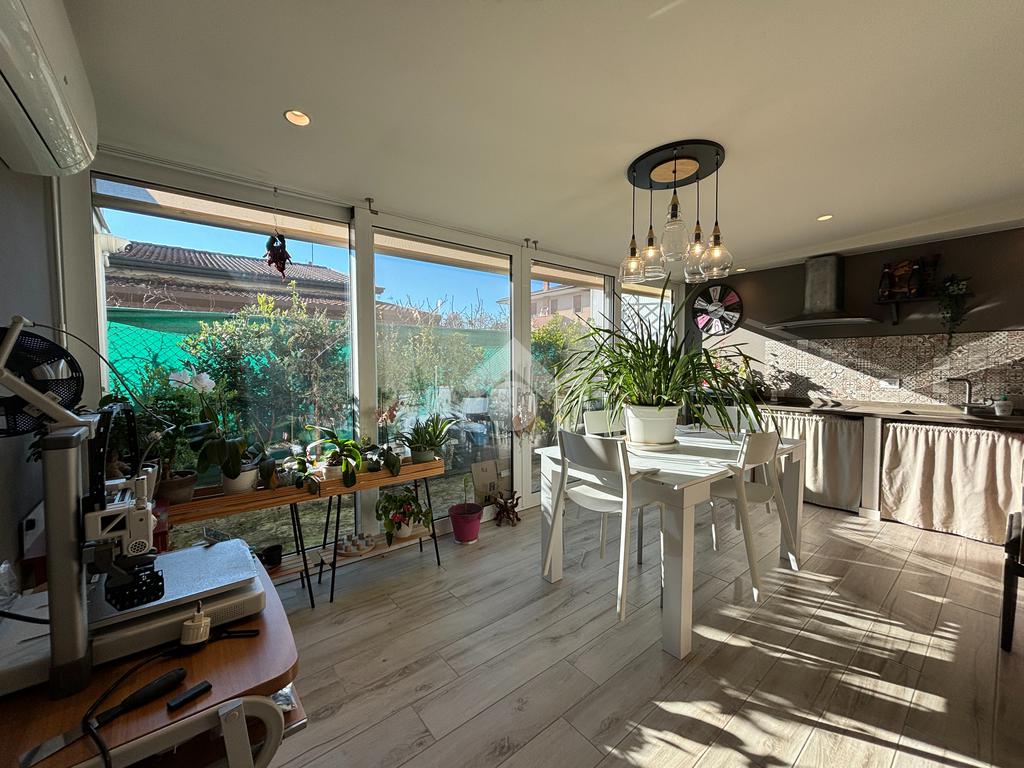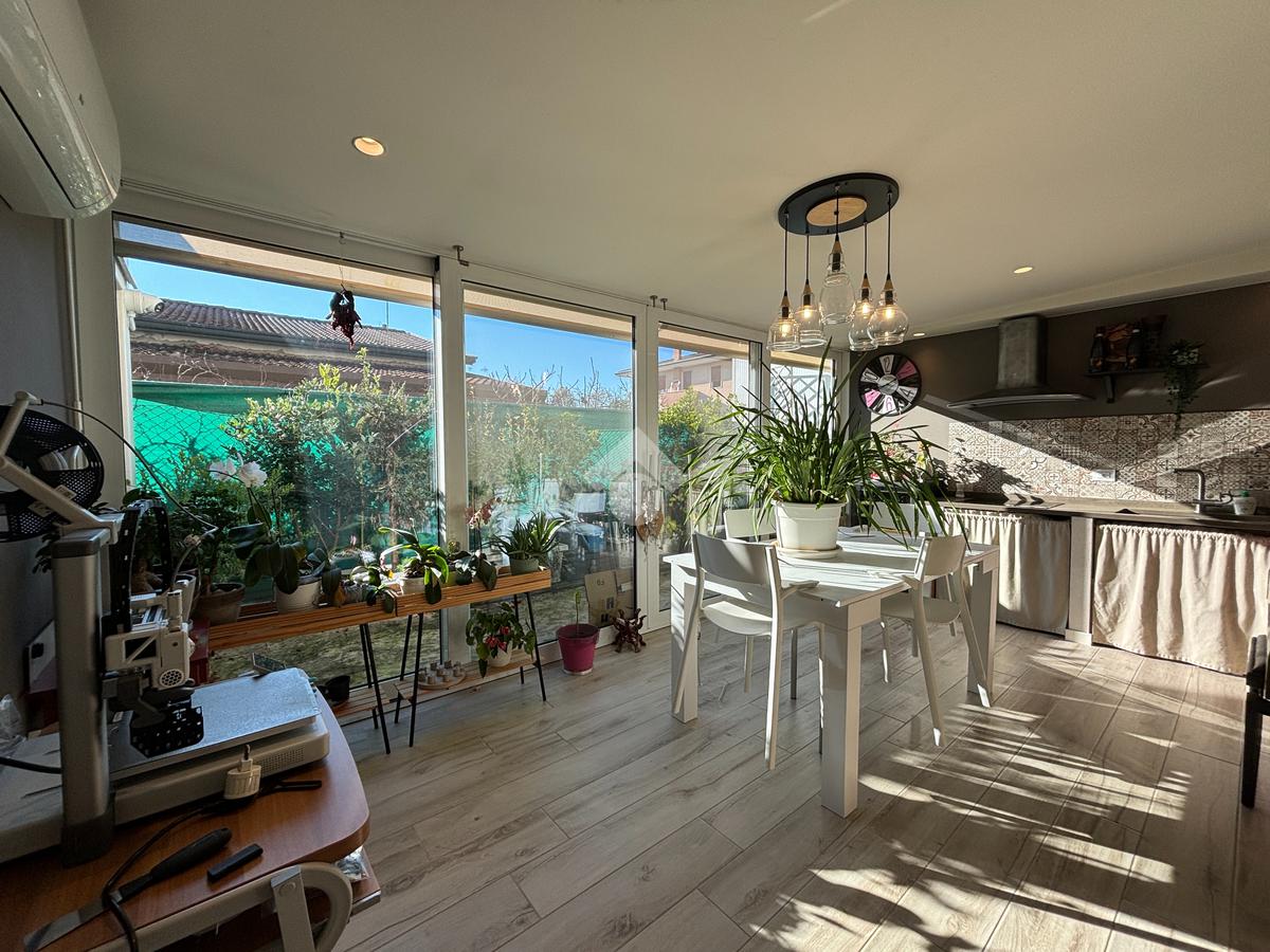 Dalla zona giorno si può inoltre accedere ad un dehor molto luminoso, esposto a sud, dove è stato ricavato un altro angolo cottura, rendendolo perfetto per pranzi e cene con gli amici.